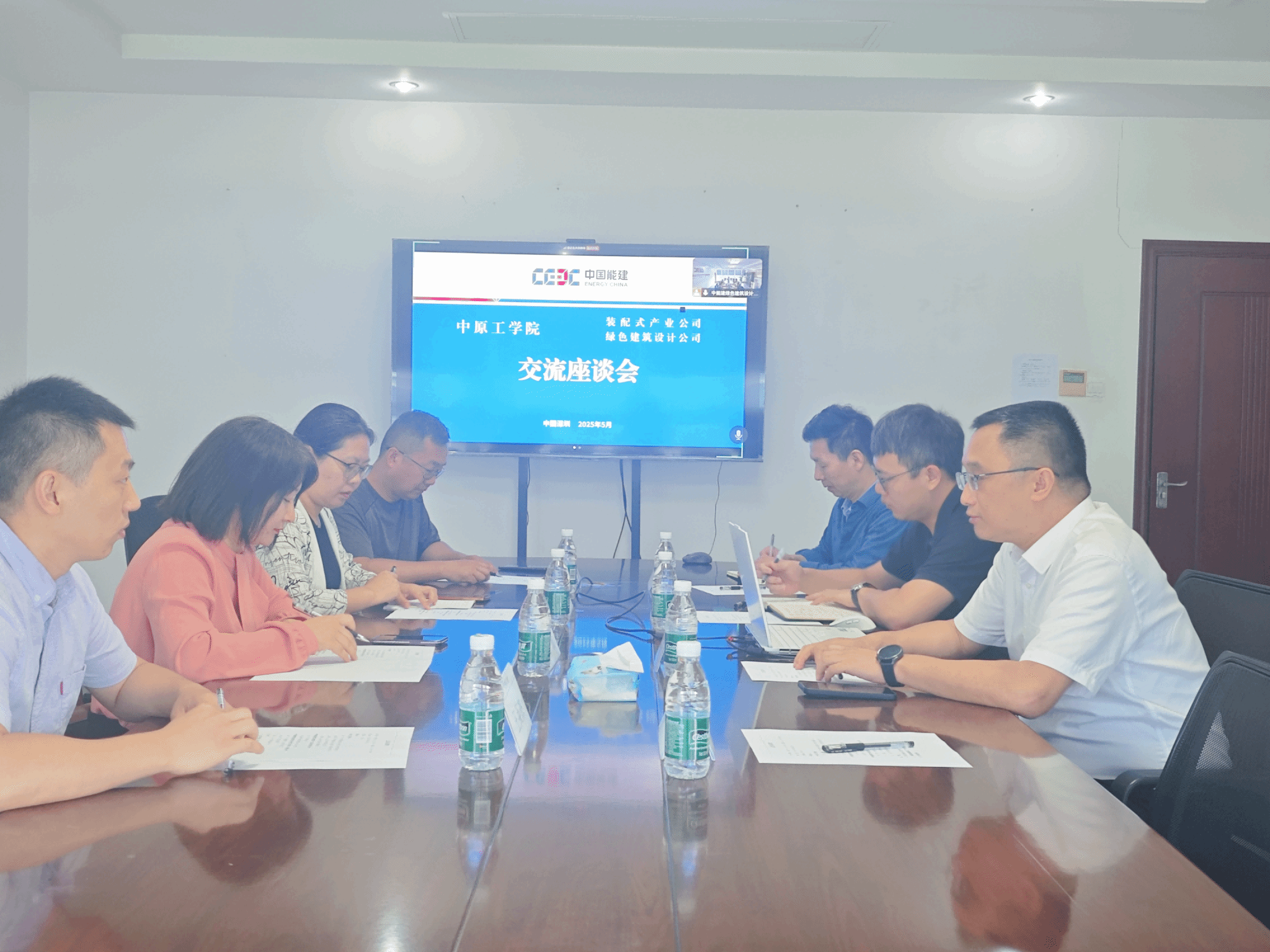 我院土木工程系副主任王英杰、骨干教师王燕锋,中能建装配式建筑产业发展有限公司副总工李政、智能智慧公司总经理刘志鹏,中能建绿色建筑设计研究(深圳)有限公司董事长曾科、总工程师和宽、结构所副所长荔涧参与座谈。