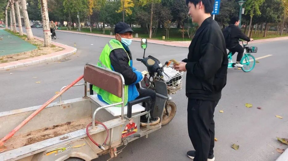 银杏小径旁,志愿者迎上刚扫完落叶的清洁工大爷,递过暖宝宝:“大爷,重阳快乐!您一早扫落叶辛苦,这个揣兜里暖身子。”大爷接过,指尖触到暖宝宝的温,笑着说:“这小家伙暖,你们的心意更暖!”