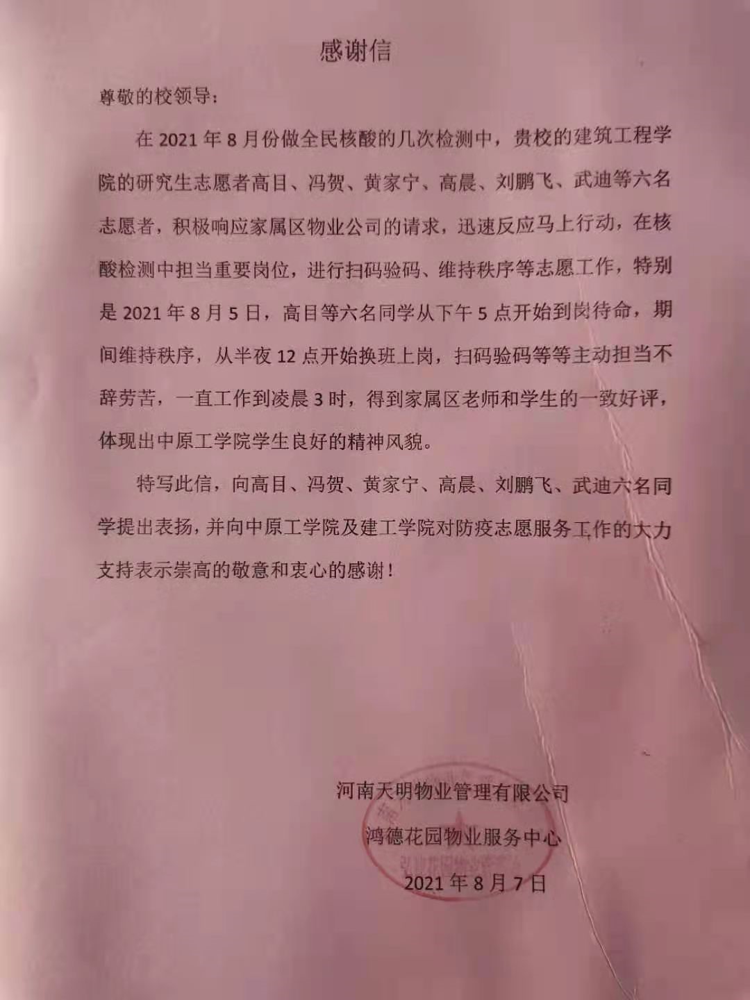公司高目、冯贺、黄家宁、高晨、刘鹏飞、武迪六名留校研究生积极响应鸿德花园物业服务中心的号召,向所在社区党总支主动请缨,协助基层抗疫,在做好个人防护的基础上,积极投身到核酸检测志愿服务当中。河南天明物业管理有限公司特写感谢信向上述六位同学提出表扬,信中写到这六名同学勇于担当,不辞劳苦,得到了家属区老师和员工的一致好评,充分展现了VSport体育官网建筑工程公司研究生的良好精神风貌,并向VSport体育官网及建筑工程公司对防疫志愿者服务工作的大力支持表示崇高的敬意和衷心的感谢。公司19级樊帅龙,20级张建树、李子山、王浩聿、杨秉昊、方帅超等同学分别在所在地参与疫情防控志愿者工作,为抗击疫情贡献自己的青春力量。