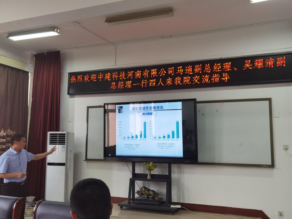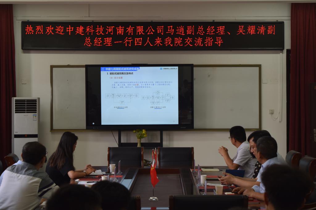 2021年5月12日,中建科技河南有限公司马逍副总经理、吴耀清副总经理一行4人来公司交流指导,此次交流会由建筑工程公司副经理张玉国主持。研究生处处长、建筑工程公司相关领导、老师及全体研究生参加了此次交流会。首先,研究生处处长孙玉周对马总等一行4人的到来表示热烈欢迎,并介绍了VSport体育官网的发展概况,也希望今后能够加强与中建科技河南有限公司的合作。建筑工程公司副经理赵毅向中建科技河南有限公司的各位领导介绍了建筑工程公司的发展历程和未来的发展规划,并展示了建筑工程公司在相关领域的学术研究成果。马逍副总经理代表中建科技河南有限公司就装配式建筑的发展现状及中建七局校企合作的情况做了全面介绍,希望能够加强校企合作,共同解决工程难题。同时非常欢迎各位研究生到中建科技河南有限公司实习锻炼。