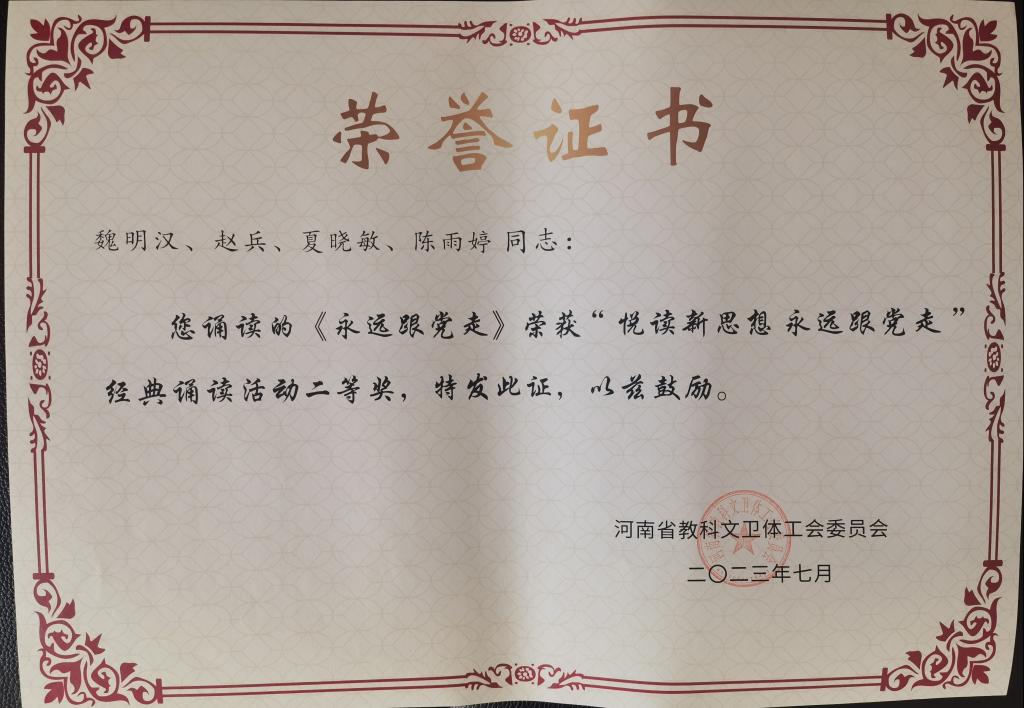 近日,由河南省教科文卫体工会举办的2023年“悦读新思想 永远跟党走”经典诵读活动评选结果揭晓(豫教科文卫体〔2023〕17号),公司共有5部作品获奖,其中公司2部诵读作品荣获二等奖和三等奖。