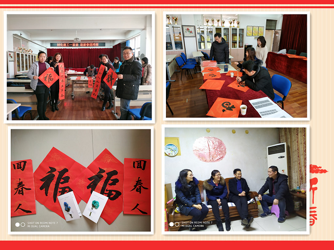 1月17日上午,建筑工程公司和材料与化工公司分工会在2号实验楼543,开展新春送福活动,邀请了公司书法协会的三位教师为大家现场送春联。樊平老师挥毫的春联,徐兆龙老师和刘瑞丽老师绘画的切合中国传统生肖年的”猪猪福”大受欢迎。在写春联现场,公司领导特别叮嘱给退休教工书写祝福的春联。