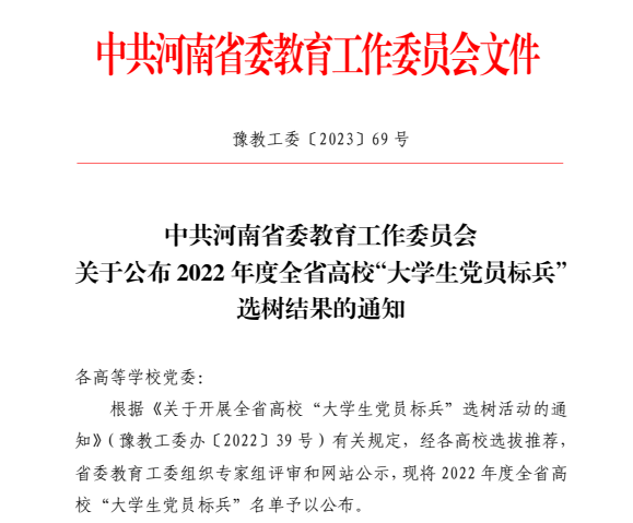 近日,由中共河南省委教育工委开展的全省高校“老员工党员标兵”评审结果揭晓。经公司推荐、省委教育工委评审,公司20级研究生燕依梦荣获“老员工党员标兵”称号。