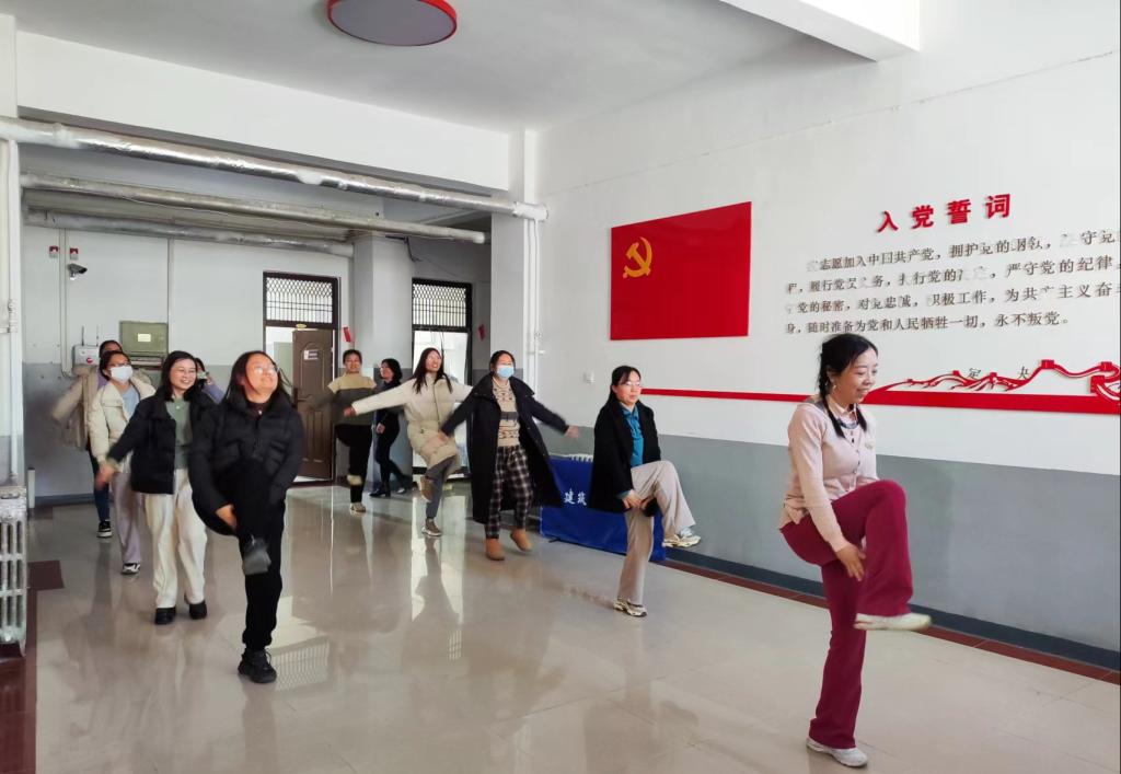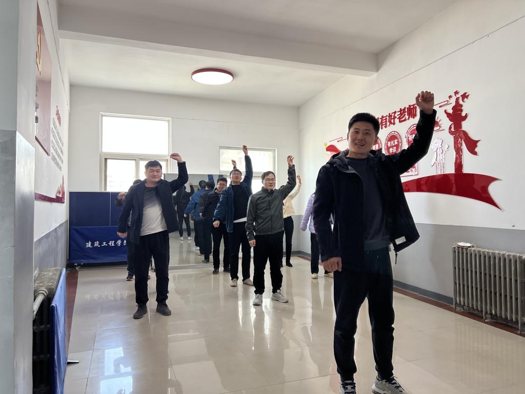 活动启动后,每周二、四上午大课间,赵兵老师和于莉老师分别带领大家进行广播体操和动感十足的啦啦操练习,锻炼期间,大家从僵硬的肢体动作,到慢慢跟上节拍,到熟练跟随动感音乐,一个又一个的八拍动作,连贯舒展展示出教师的自信。课间操既锻炼了身体,又愉悦了身心,锻炼结束后,大家活力满满投入紧张的教学科研工作中。